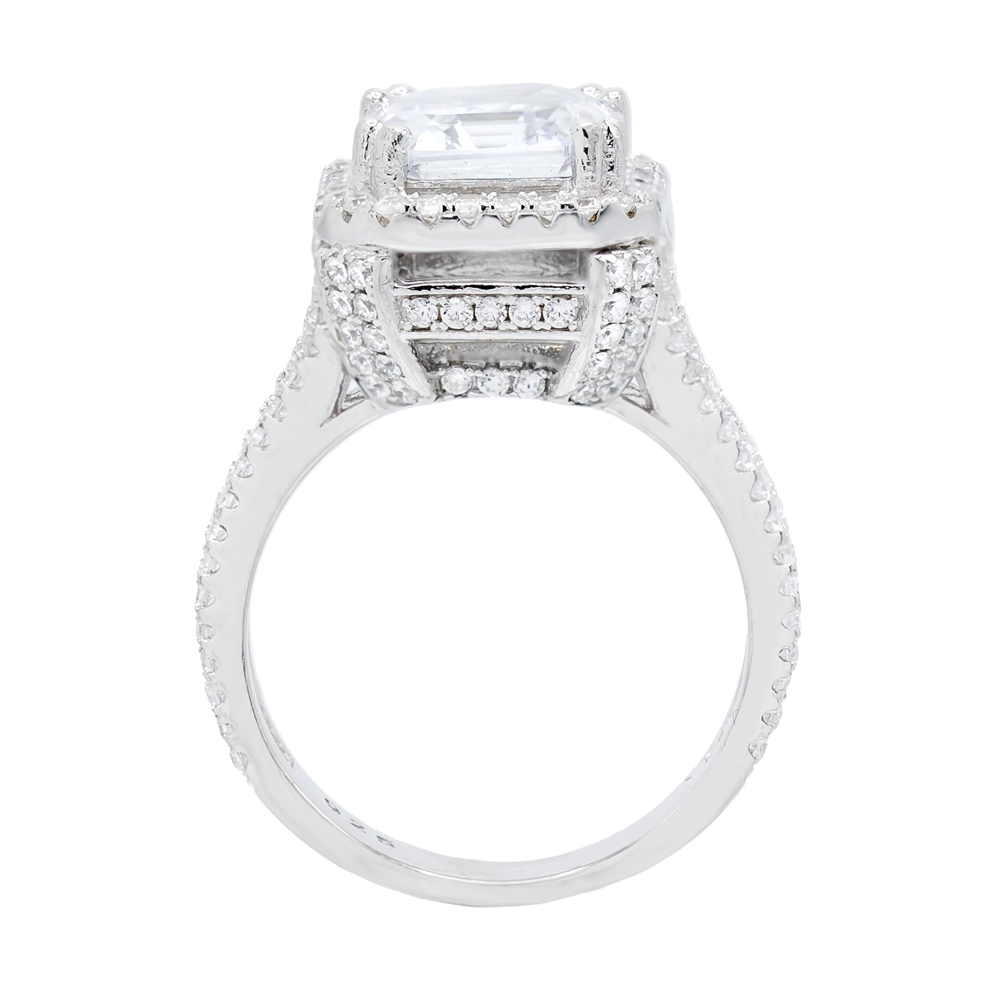 Show off your trendsetting fashion with this sparkling Asscher-cut prong-set AAA cubic zirconia solitaire ring that will sure to get you noticed and round-cut halo-set AAA grade cubic zirconia and round-cut pave-set double split shank add an eye-catching sparkle that brings out the luxury in you. This impressive ring is brightly polished, rhodium-plated sterling silver and stamped 925 that gives this solitaire ring a solid sense of style.