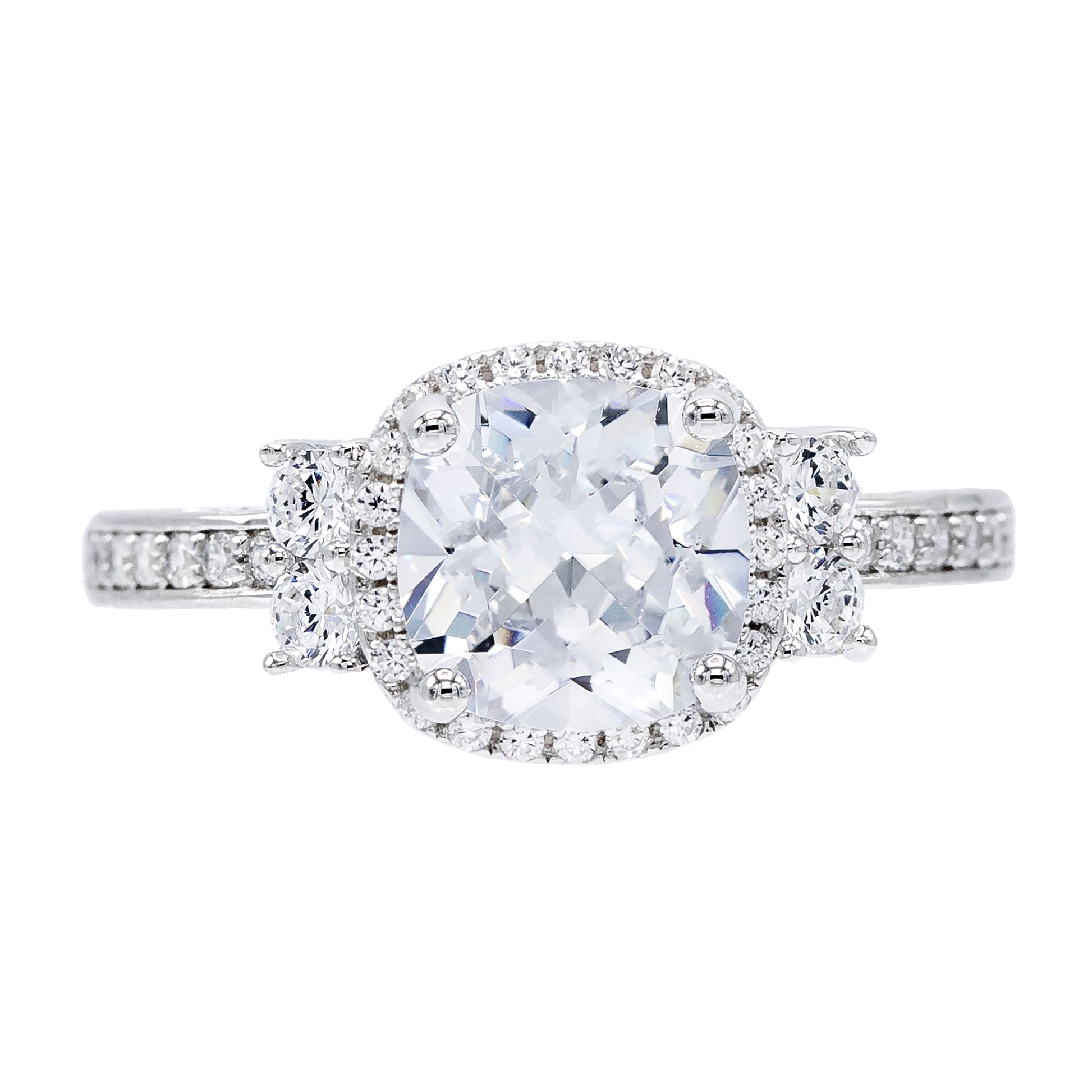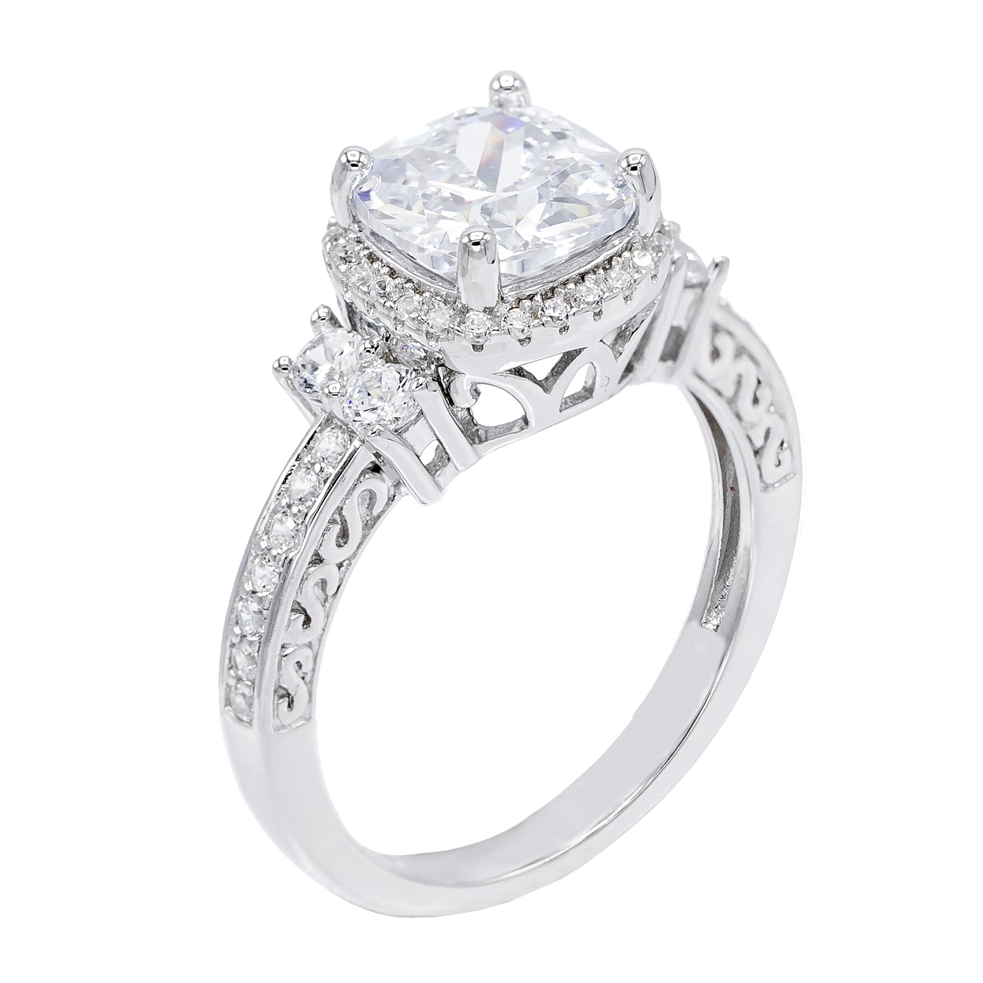 Show off your trendsetting fashion with this sparkling cushion-cut halo-set cubic zirconia with two round-cut prong-set cubic zirconia stones on both sides that will sure to get you noticed and the round-cut pave-set AAA grade cubic zirconia on the shank and filigree on the gallery and on the sides of the shank adds an eye-catching sparkle that brings out the luxury in you. This impressive ring is brightly polished, rhodium-plated sterling silver and stamped 925 that gives this solitaire ring a solid sense of style.